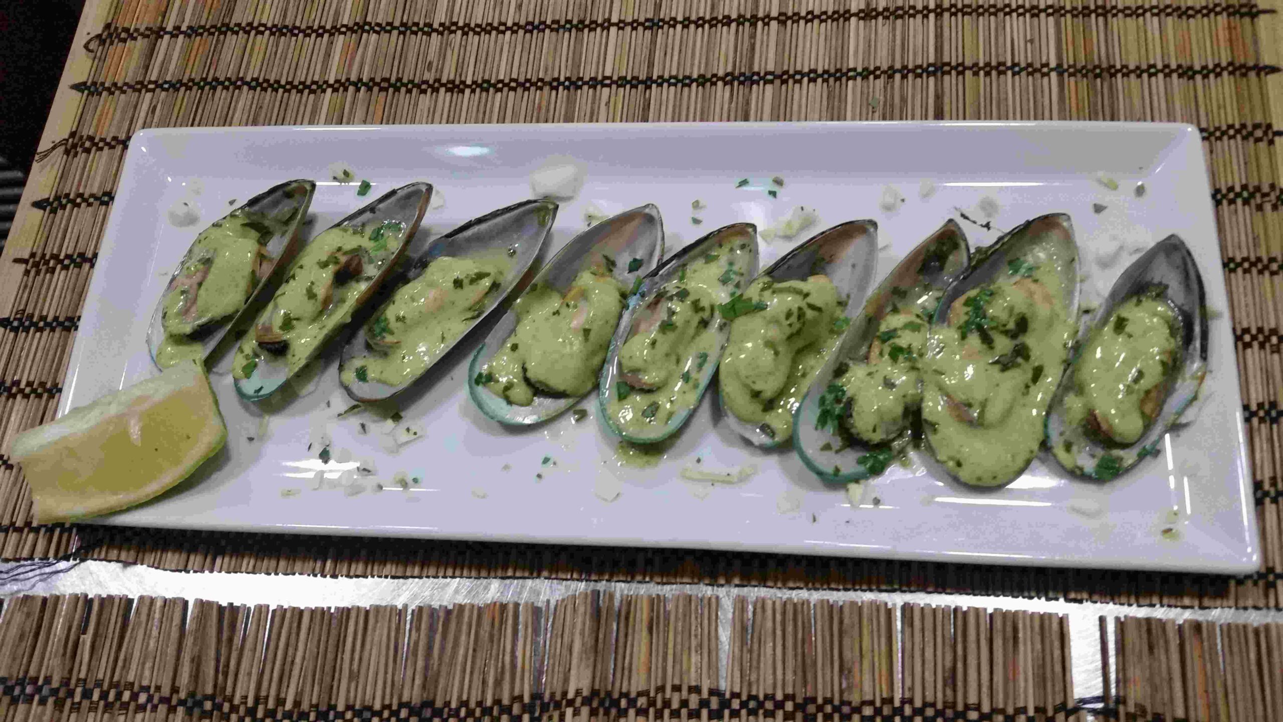 -Deliciosos mejillones a la plancha con un mojito canario verde. ¡¡Para chuparse los dedos!!